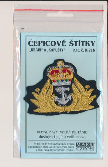 Čepicové štítky „krabi“ a „kapusty“ Kat. č. K-21b Royal Navy, Velká Británie, důstojníci jejího veličenstva Repliky vyšívaných čepicových štítků dodává nakladatelství Mare-Czech, www.mare-czech.